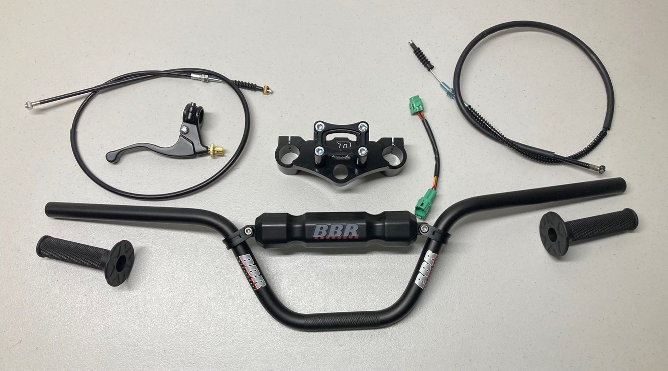 Kit includes: Billetware KLX110 Top Clamp, BBR Black Tall Bars, Extended Front Brake Cable, Brake Perch/Lever, and ProTaper Grips.