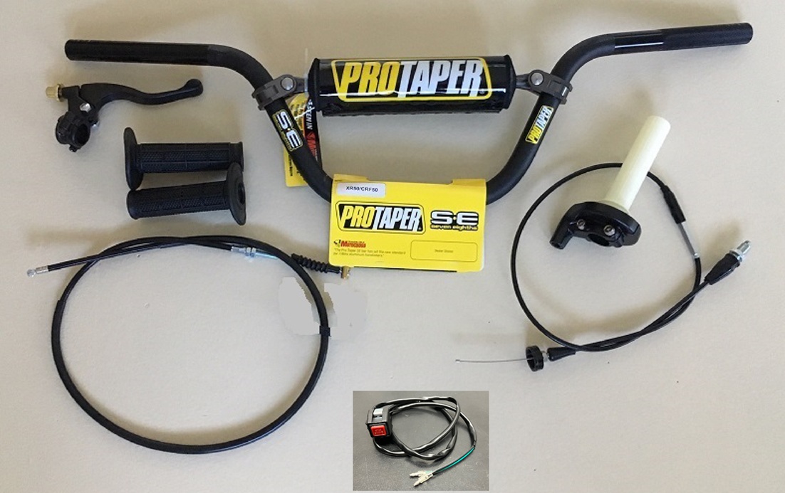 Complete kit includes: Black Pro Taper bars, extended throttle cable, *** SILVER *** machined carb top, throttle assembly, extended front brake cable, Shorty style brake Lever/Perch, and Pro Taper Full Diamond Black grips OR Pro Taper White R/C Grips.