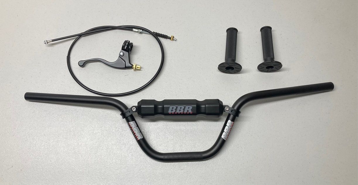 Kit includes: BBR Black Tall Bars, Extended Front Brake Cable, Brake Perch/Lever, and ProTaper Grips.